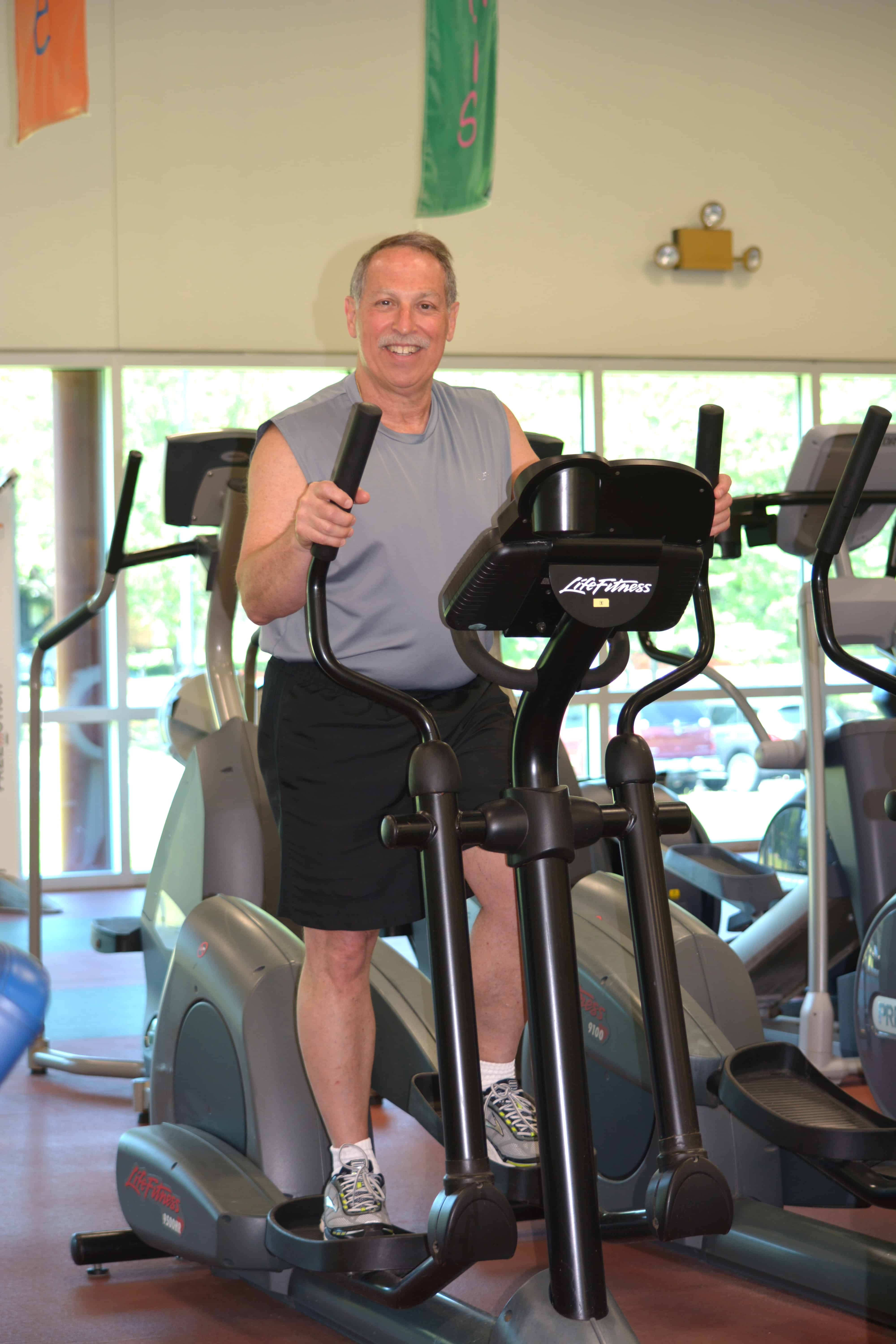 Keith works out about four times a week for about an hour and a half. “Two times I’m here for the body pumping class. It’s a wonderful class with Rachell and a wonderful group of people in it. We have our work cut out for us during this class.” After that Keith continues his aerobic workout either running or on the cross trainer and jumping rope. The other days he lifts weights and stretches. “I do a lot of stretching. When you get my age you really have to stretch. And even with that I don’t consider myself agile. That was not given to me somehow.”